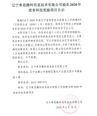 辽宁希思腾科信息技术有限公司提名2019年度省科技奖励项目公示